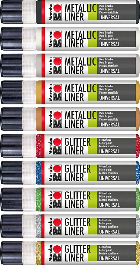 Lieferumfang: 5 x 25 ml Marabu Metallic Liner (Metallic-Graphit 779, Metallic-Weiß 770, Metallic-Silber 782, Metallic-Gold 784, Metallic-Kupfer 787), 5 x 25 ml Marabu Glitter Liner (Glitter-Rubin 538, Glitter-Saphir 594, Glitter-Kiwi 561, Glitter-Silber 582, Glitter-Gold 584)